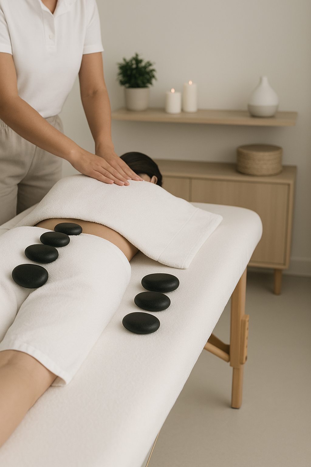 Incluye el uso de aparatos de masaje con tecnología de calor, frío, vibración y piedras calientes, diseñados para aliviar la tensión muscular, mejorar la circulación y promover una relajación profunda.